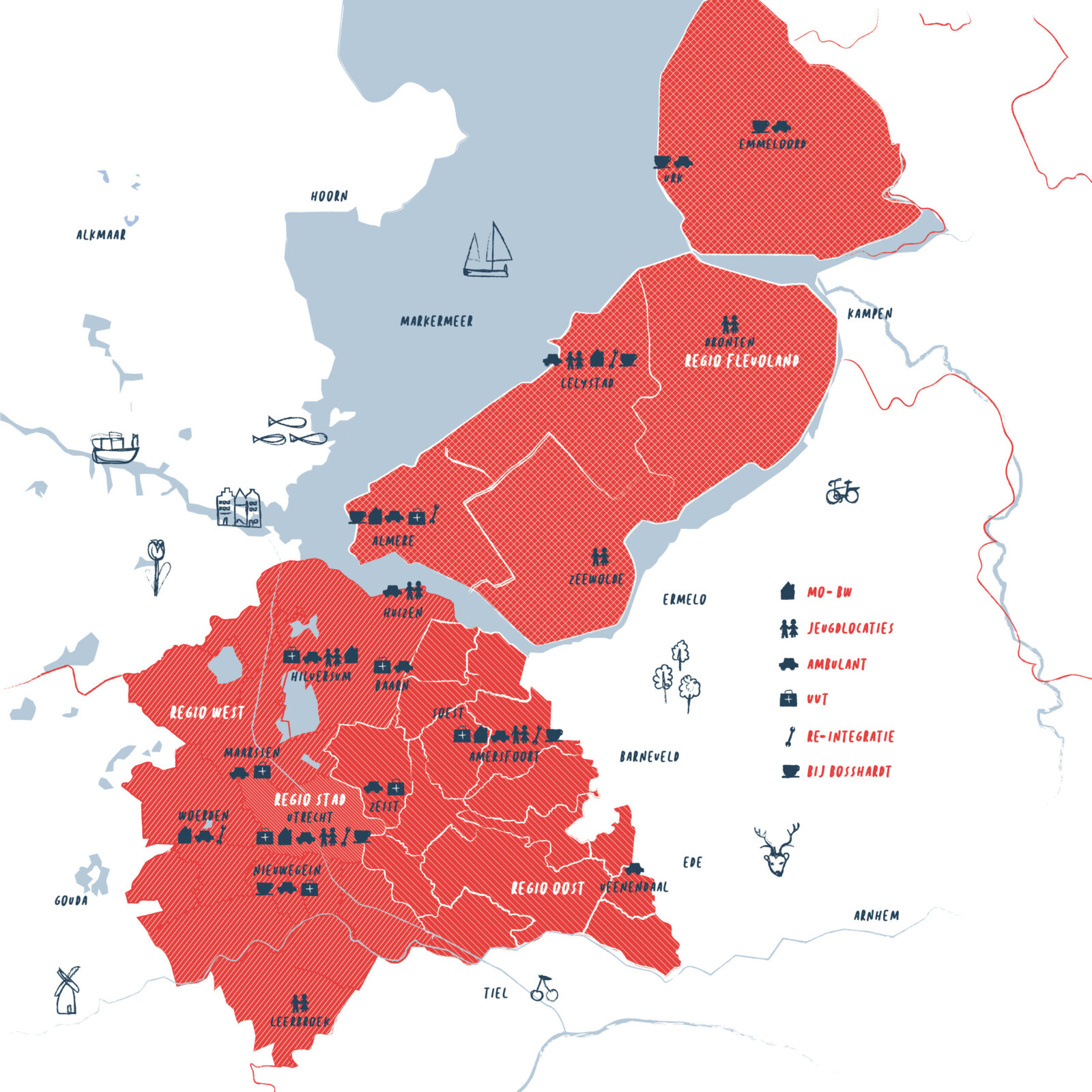 Onder regio West vallen Nieuwegein, Lekstroom, Stichtse Vecht, Woerden en de Gooi & Vechtstreek. In deze regio bieden wij ambulante hulpverlening, maatschappelijke opvang en beschermd wonen, arbeidsre-integratie, jeugdhulp en verpleging & verzorging. Daarnaast zijn er diverse Bij Bosshardt locaties, waar buurtbewoners terecht kunnen voor activiteiten.